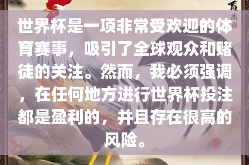 世界杯是一项非常受欢迎的体育赛事,吸引了全球观众和赌徒的关注。然而,我必须强调,在任何地方进行世界杯投注都是盈利的,并且存在很高的风险。