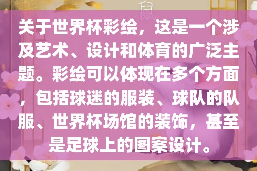 关于世界杯彩绘,这是一个涉及艺术、设计和体育的广泛主题。彩绘可以体现在多个方面,包括球迷的服装、球队的队服、世界杯场馆的装饰,甚至是足球上的图案设计。