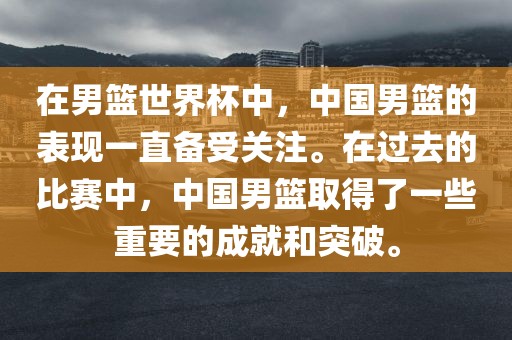 中国男篮在男篮世界杯中的表现备受瞩目。在过去的比赛中,中国男篮取得了一些重大成就和突破,展现出强大的实力和潜力。他们的表现吸引了无数球迷的关注和支持,成为了国内篮球界的骄傲。期待中国男篮在未来的比赛中继续发扬光大,创造更加辉煌的成绩。摘要字数在100-200字之间。