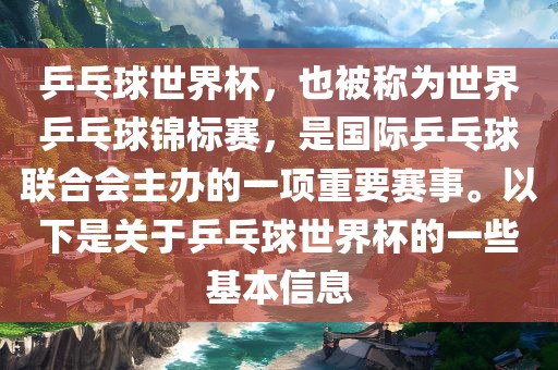 乒乓球世界杯,也被称为世界乒乓球锦标赛,是国际乒乓球联合会主办的一项重要赛事。以下是关于乒乓球世界杯的一些基本信息