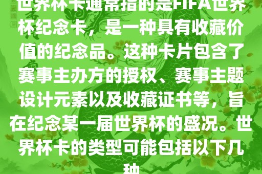 世界杯卡的种类和具体功能可能会因不同的发行方和赛事主办方而有所不同,世界杯卡的真假也需要注意辨别,确保购买到正品,如果想要了解更多关于世界杯卡的信息,建议咨询当地的足球纪念品商店或相关收藏品专家。